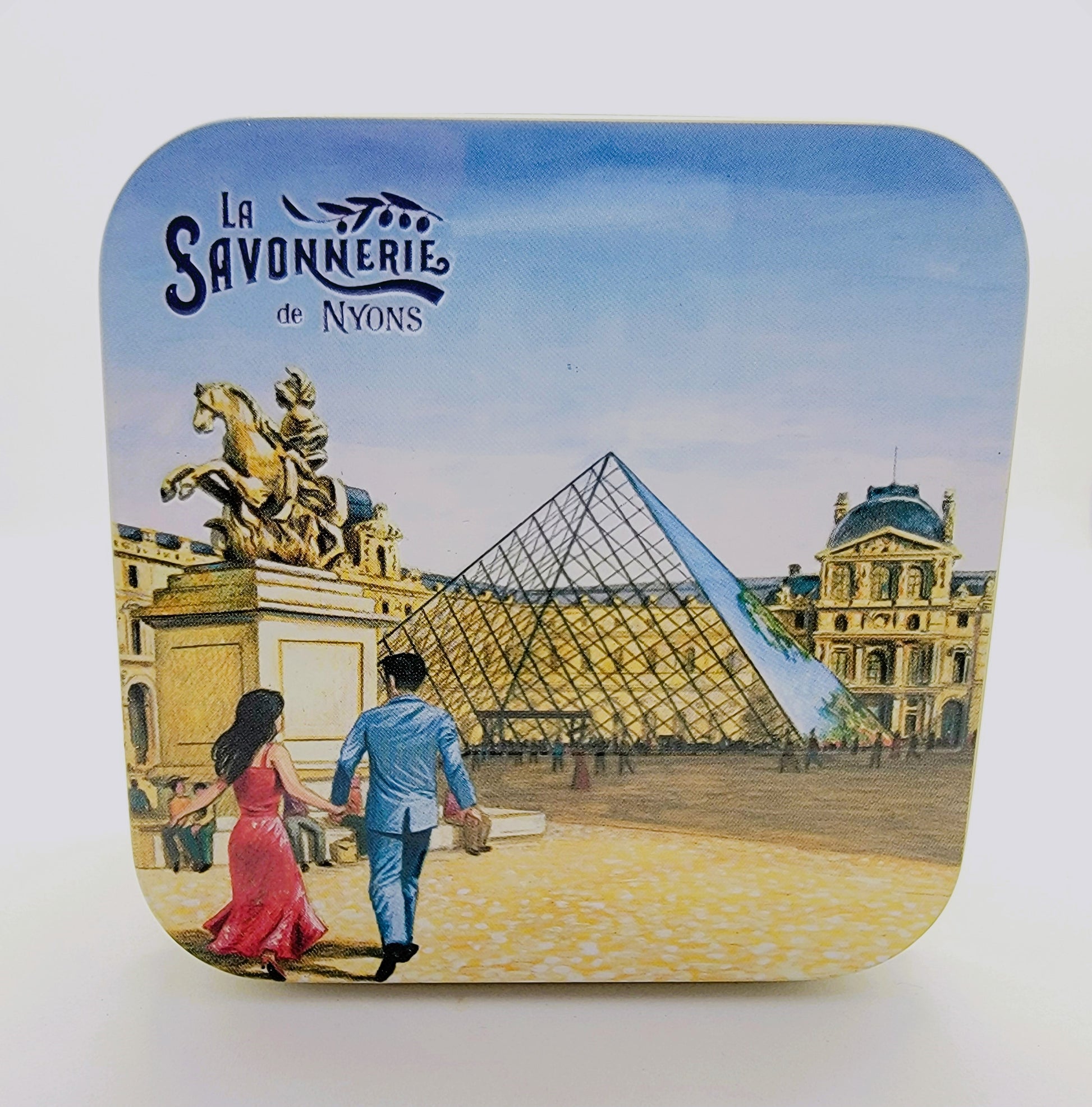 This iconic French made vintage "La Pyramide" tin box comes with its 3.5oz cotton flower-scented soap, enriched with organic shea butter and Nyons olive oil, two ingredients with protective and skin-softening properties, which can be used on all skin types.