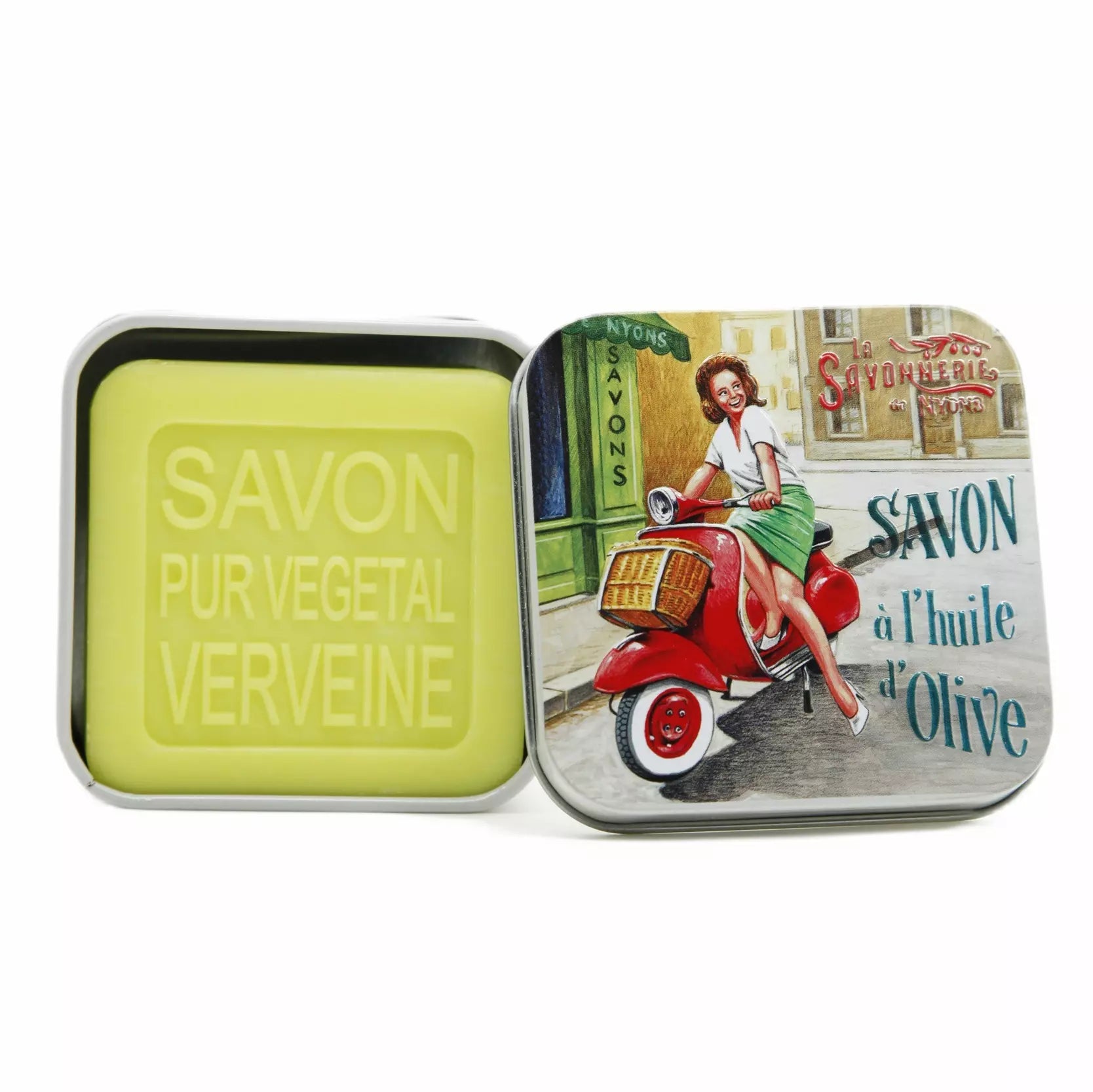 This fun French Made vintage "Vespa" tin box comes with its 3.5oz Vervain-scented soap, a fragrance inspired by the freshness of the verbena leaves. Enriched with organic shea butter and Nyons olive oil, two ingredients with protective and skin-softening properties, leaving your skin fresh, soft, with a light scent of vervain. A soap that is gentle to all skin types.